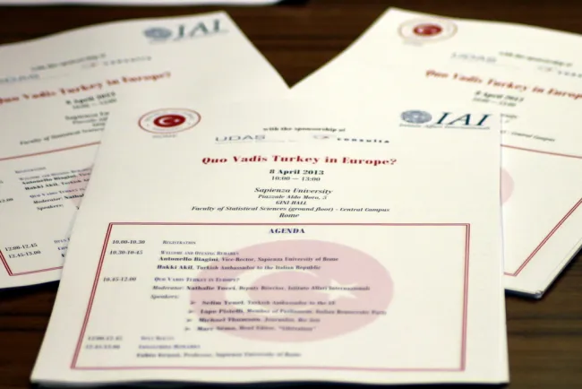 The “Quo Vadis Turkey in Europe?” debate was moderated by Nathalie Tocci, deputy director of IAI, and introduced by Antonello Biagini, deputy rector of La Sapienza University. Various speakers took part: Hakki Akil, Turkish Ambassador to Italy; Selim Yenel, Turkish Ambassador to the EU; Lapo Pistelli, Member of Parliament, Italian Democratic Party; Michael Thumann, journalist for Die Zeit; and Marc Sémo, Editor-in-chief of “Libération”.