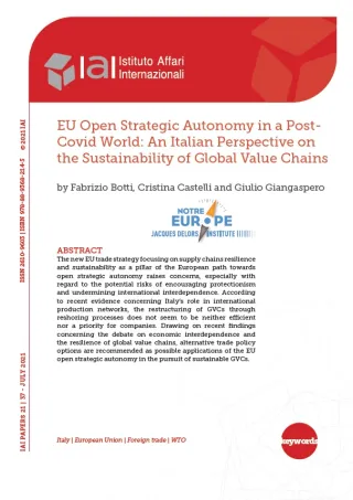 The new EU trade strategy focusing on supply chains resilience and sustainability as a pillar of the European path towards open strategic autonomy raises concerns, especially with regard to the potential risks of encouraging protectionism and undermining international interdependence. According to recent evidence concerning Italy’s role in international production networks, the restructuring of GVCs through reshoring processes does not seem to be neither efficient nor a priority for companies. Drawing on recent findings concerning the debate on economic interdependence and the resilience of global value chains, alternative trade policy options are recommended as possible applications of the EU open strategic autonomy in the pursuit of sustainable GVCs.
