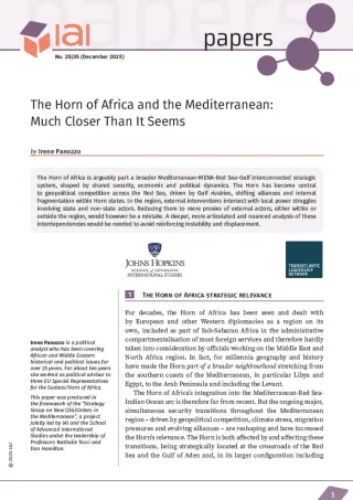 The Horn of Africa is arguably part a broader Mediterranean-MENA-Red Sea-Gulf interconnected strategic system, shaped by shared security, economic and political dynamics. The Horn has become central to geopolitical competition across the Red Sea, driven by Gulf rivalries, shifting alliances and internal fragmentation within Horn states. In the region, external interventions intersect with local power struggles involving state and non-state actors. Reducing them to mere proxies of external actors, either within or outside the region, would however be a mistake. A deeper, more articulated and nuanced analysis of these interdependencies would be needed to avoid reinforcing instability and displacement.