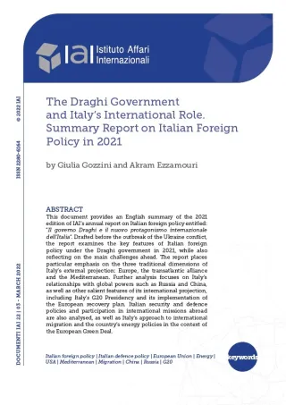This document provides an English summary of the 2021 edition of IAI’s annual report on Italian foreign policy entitled: “Il governo Draghi e il nuovo protagonismo internazionale dell’Italia”. Drafted before the outbreak of the Ukraine conflict, the report examines the key features of Italian foreign policy under the Draghi government in 2021, while also reflecting on the main challenges ahead. The report places particular emphasis on the three traditional dimensions of Italy’s external projection: Europe, the transatlantic alliance and the Mediterranean. Further analysis focuses on Italy’s relationships with global powers such as Russia and China, as well as other salient features of its international projection, including Italy’s G20 Presidency and its implementation of the European recovery plan. Italian security and defence policies and participation in international missions abroad are also analysed, as well as Italy’s approach to international migration and the country’s energy policies in the context of the European Green Deal.