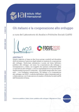 This report, based on two focus groups held in December 2023, examines the Italians’ opinion on development cooperation. Great attention is given to the issue of official development assistance (ODA), to the link between development cooperation and immigration and, finally, to the entities operating in this field, such as non-governmental organisations. This analysis is in continuity – both in terms of time and results – with the survey “Italians and Development Cooperation in 2023”, conducted by the Istituto Affari Internazionali in collaboration with the Political and Social Analysis Laboratory (LAPS) of the University of Siena.