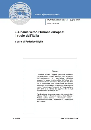 La ricerca analizza i rapporti, politici ed economici, che intercorrono tra Italia e Albania nella prospettiva dell’avvicinamento di quest’ultima all’Unione europea. Lo studio è stato redatto dall’Istituto affari internazionali (IAI) nell’ambito del progetto “Aquifalc” per la promozione della cooperazione istituzionale, economica e culturale fra Ue e Albania, finanziato dal Nuovo Programma di Prossimità NPP Interreg/Cards 2004-2006 e coordinato dal Dipartimento di Studi economici dell’Università di Bari.
