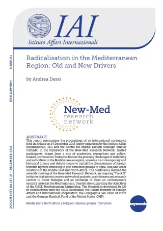 This report summarises the proceedings of an international conference held in Ankara on 14 December 2015 jointly organised by the Istituto Affari Internazionali (IAI) and the Centre for Middle Eastern Strategic Studies (ORSAM) in the framework of the New-Med Research Network. Invited participants, drawn from a mix of academics, researchers and policy-makers, convened in Turkey to discuss the pressing challenges of instability and radicalism in the Mediterranean region, examine its contemporary and historical drivers and debate means to curtail the phenomenon of foreign terrorist fighters travelling to join extremist groups in Syria, Iraq and other locations in the Middle East and North Africa. The conference marked the seventh meeting of the New-Med Research Network, an ongoing “Track II” initiative that aims to create a network of analysts, practitioners and research centres to foster dialogue and an exchange of ideas on contemporary security issues in the Mediterranean, thereby also supporting the objectives of the OSCE-Mediterranean Partnership. The Network is developed by IAI in collaboration with the OSCE Secretariat, the Italian Ministry of Foreign Affairs and International Cooperation, the Compagnia San Paolo of Turin and the German Marshall Fund of the United States (GMF).