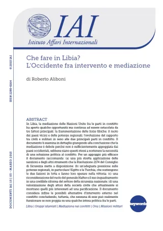 In Libya, the UN mediation among the parties in conflict has opened up opportunities, but is still hindered by three main factors: the fragmentation of Libyan forces, the role of neighbouring countries and regional powers, and the evolution of civilian-military relations between the two main parties to the conflict. This paper takes a detailed look at all of them, concluding that mediation is weak because it is not sufficiently supported by western countries, even though they are the ones who insist that a political solution has to be found. For more effective backing, this paper recommends: a) tighter application of the sanctions and other instruments called for in Security Council resolution 2174; b) adequate pressure on regional powers – particularly Egypt and Turkey – who support the two parties in the conflict and give them hope for victory; c) a reconsideration of General Hafter's role as part of a credible reform of the national security sector; d) more room for civil society actors, who seem to be the most interested in peace. Finally, the document considers the possible alternatives of external intervention, concluding however that none of them can realistically work unless based on some kind of political agreement among the parties.
