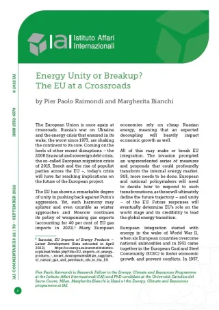 Pier Paolo Raimondi is Research Fellow in the Energy, Climate and Resources Programme at the Istituto Affari Internazionali (IAI) and PhD candidate at the Università Cattolica del Sacro Cuore, Milan. Margherita Bianchi is Head of the Energy, Climate and Resources programme at IAI.