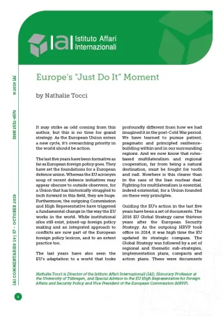 * Nathalie Tocci is Director of the Istituto Affari Internazionali (IAI), Honorary Professor at the University of Tübingen, and Special Advisor to the EU High Representative for Foreign Affairs and Security Policy and Vice President of the European Commission (HRVP).