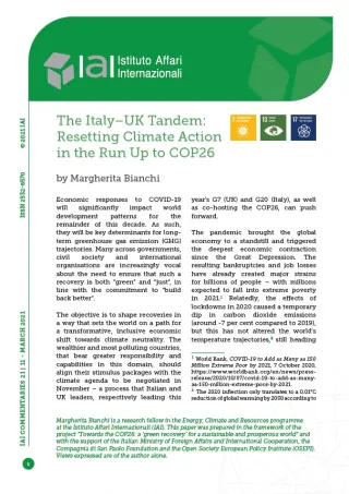 * Margherita Bianchi is a research fellow in the Energy, Climate and Resources programme at the Istituto Affari Internazionali (IAI). This paper was prepared in the framework of the project “Towards the COP26: a 'green recovery' for a sustainable and prosperous world” and with the support of the Italian Ministry of Foreign Affairs and International Cooperation, the Compagnia di San Paolo Foundation and the Open Society European Policy Institute (OSEPI). Views expressed are of the author alone.
