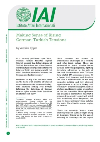 Such tensions are driven by international challenges of a security and value-based nature. These are embedded in much broader issues such as controlling migration, fighting terrorism, adherence to the rule of law and disagreements over Turkey’s long-stalled EU accession process. At a deeper level however, such tensions are also a manifestation of the way domestic politics and key electoral appointments – in both Turkey and Germany – are influencing the political rhetoric and foreign policy orientation of the two countries. These spillovers are creating a combustible mix that if managed incorrectly could well spiral into something more dangerous, not only for the countries involved but also the wider Euro-Mediterranean region as a whole.