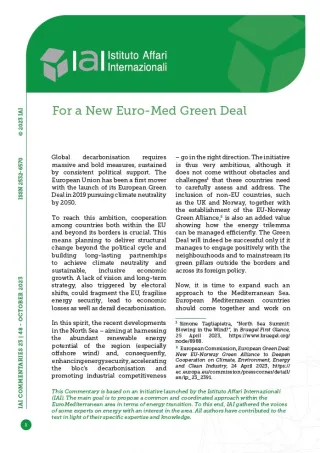 This Commentary is based on an initiative launched by IAI. The main goal is to propose a common and coordinated approach within the EuroMediterranean area in terms of energy transition. To this end, IAI gathered the voices of some experts on energy with an interest in the area. All authors have contributed to the text in light of their specific expertise and knowledge.