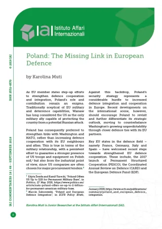 Poland, the most relevant Central-Eastern EU member state in terms of defence spending, territory and population has been marginally involved, however, displaying some reluctance to join the European effort. As a result, Warsaw risks being excluded from the process, an eventuality that would further crystalize divisions across Europe when it comes to security interests and defence cooperation.