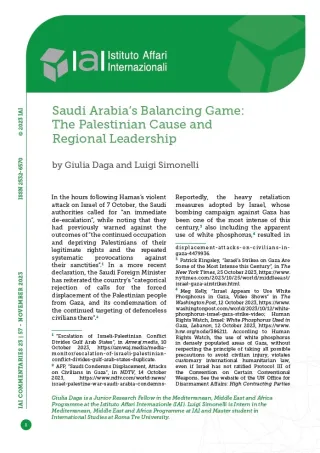 [2] AFP, “Saudi Condemns Displacement, Attacks on Civilians in Gaza”, in NDTV, 14 October 2023, https://www.ndtv.com/world-news/israel-palestine-war-saudi-arabia-condemns-displacement-attacks-on-civilians-in-gaza-4479936.