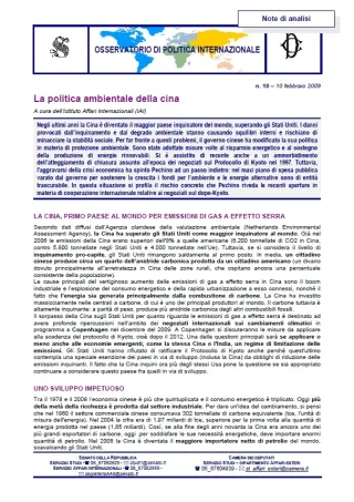 Negli ultimi anni la Cina è diventato il maggior paese inquinatore del mondo, superando gli Stati Uniti. I danni provocati dall’inquinamento e dal degrado ambientale stanno causando squilibri interni e rischiano di minacciare la stabilità sociale. Per far fronte a questi problemi, il governo cinese ha modificato la sua politica in materia di protezione ambientale. Sono state adottate misure volte al risparmio energetico e al sostegno della produzione di energie rinnovabili. Si è assistito di recente anche a un ammorbidimento dell’atteggiamento di chiusura assunto all’epoca dei negoziati sul Protocollo di Kyoto nel 1997. Tuttavia, l'aggravarsi della crisi economica ha spinto Pechino ad un passo indietro: nel maxi piano di spesa pubblica varato dal governo per sostenere la crescita i fondi per l’ambiente e le energie alternative sono di entità trascurabile. In questa situazione si profila il rischio concreto che Pechino riveda le recenti aperture in materia di cooperazione internazionale relative ai negoziati sul dopo-Kyoto.