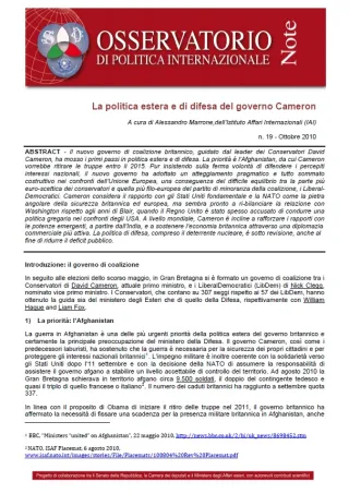 Il nuovo governo di coalizione britannico, guidato dal leader dei Conservatori David Cameron, ha mosso i primi passi in politica estera e di difesa. La priorità è l’Afghanistan, da cui Cameron vorrebbe ritirare le truppe entro il 2015. Pur insistendo sulla ferma volontà di difendere i percepiti interessi nazionali, il nuovo governo ha adottato un atteggiamento pragmatico e tutto sommato costruttivo nei confronti dell’Unione Europea, una conseguenza del difficile equilibrio tra la parte più euro-scettica dei conservatori e quella più filo-europea del partito di minoranza della coalizione, i Liberal-Democratici. Cameron considera il rapporto con gli Stati Uniti fondamentale e la NATO come la pietra angolare della sicurezza britannica ed europea, ma sembra pronto a ri-bilanciare la relazione con Washington rispetto agli anni di Blair, quando il Regno Unito è stato spesso accusato di condurre una politica gregaria nei confronti degli USA. A livello mondiale, Cameron è incline a rafforzare i rapporti con le potenze emergenti, a partire dall’India, e a sostenere l’economia britannica attraverso una diplomazia commerciale più attiva. La politica di difesa, compreso il deterrente nucleare, è sotto revisione, anche al fine di ridurre il deficit pubblico.