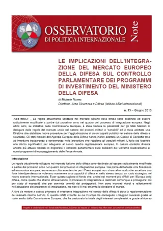 Le regole attualmente utilizzate nel mercato italiano della difesa sono destinate ad essere radicalmente modificate a partire dal prossimo anno nel quadro del processo di integrazione europea. Negli ultimi anni, su iniziativa della Commissione Europea, è stata limitata la possibilità per gli Stati Membri di derogare dalle regole del mercato unico nel settore dei prodotti militari e “sensibili” ed è stata adottata una Direttiva che stabilisce nuove procedure per l’aggiudicazione di alcuni appalti pubblici nel settore della difesa e sicurezza. Gli stati membri dell’Agenzia Europea della Difesa hanno inoltre adottato un Codice di Condotta teso ad introdurre trasparenza e concorrenza nelle procedure che regolano gli acquisti militari. L’Italia sta facendo uno sforzo significativo per adeguarsi al nuovo quadro regolamentare europeo. In questo contesto diventa ancora più attuale l’ipotesi di migliorare il controllo parlamentare sulle decisioni del Governo relativamente ai nuovi programmi di equipaggiamento delle Forze Armate.