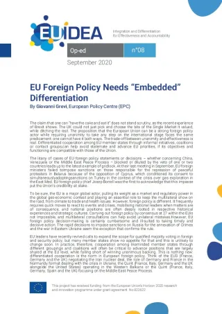 To achieve that, it is useful to distinguish between what may be called embedded differentiation and unbound differentiation. Embedded differentiation occurs when a group of member states takes action with the express aim to foster EU foreign policy objectives, through regular consultations with the EU High Representative and the European External Action Service, and via formats that are open to the participation of other EU countries that decide to bring a tangible contribution to the joint undertaking. This form of differentiated cooperation connects EU and national goals to strengthen both. While many member states may not be willing or able to get involved, they broadly accept that some of them take the lead on distinct issues. If a small minority of EU countries disagrees with specific initiatives, the involvement of common institutions and arrangements for regular dialogue on the operation of flexible formats could at least in part meet their concerns.