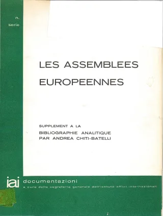 Nel 1969 I’Iai ha pubblicato una bibliografia-recensione di oltre 300 titoli comparsi tra il 1949 ed il 1967 nei paesi europei ed extraeuropei e riguardanti le assemblee europee. Precede quella raccolta un saggio introduttivo sulla natura e le caratteristiche delle varie organizzazioni rappresentative europee. Un aggiornamento di circa 100 titoli comparsi nel periodo 1968-1970 viene ora a completare la precedente documentazione ed accresce le possibilità di ricerca che un simile lavoro offre.