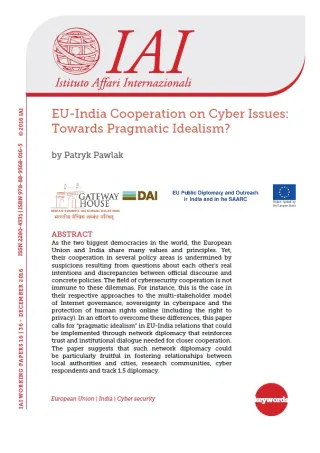 As the two biggest democracies in the world, the European Union and India share many values and principles. Yet, their cooperation in several policy areas is undermined by suspicions resulting from questions about each other’s real intentions and discrepancies between official discourse and concrete policies. The field of cybersecurity cooperation is not immune to these dilemmas. For instance, this is the case in their respective approaches to the multi-stakeholder model of Internet governance, sovereignty in cyberspace and the protection of human rights online (including the right to privacy). In an effort to overcome these differences, this paper calls for “pragmatic idealism” in EU-India relations that could be implemented through network diplomacy that reinforces trust and institutional dialogue needed for closer cooperation. The paper suggests that such network diplomacy could be particularly fruitful in fostering relationships between local authorities and cities, research communities, cyber respondents and track 1.5 diplomacy.