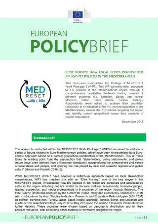 This document summarizes the findings of MEDRESET Work Package 3 (WP3). This WP surveyed elite responses to EU policies in the Mediterranean region through a comprehensive qualitative fieldwork having covered 9 different countries (i.e. Lebanon, Egypt, Iran, Israel, Morocco, Qatar, Saudi Arabia, Tunisia, Turkey). Respondents were asked to analyse their countries’ resistance to or adoption of the EU conceptualization of the Mediterranean, assess the EU policies targeting the region and identify current geopolitical issues they consider of crucial importance.