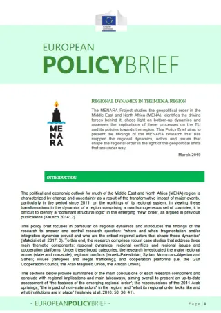 The MENARA Project studies the geopolitical order in the Middle East and North Africa (MENA), identifies the driving forces behind it, sheds light on bottom-up dynamics and assesses the implications of these processes on the EU and its policies towards the region. This Policy Brief aims to present the findings of the MENARA research that has mapped the regional dynamics, actors and issues that shape the regional order in the light of the geopolitical shifts that are under way.