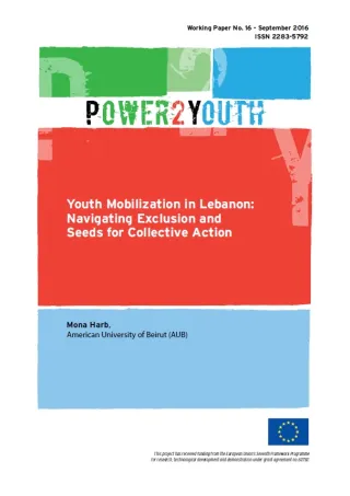 This paper investigates youth mobilization in Lebanon. It is organized in two main sections. The first section analyses patterns of youth inclusion and exclusion in the context of Lebanese sectarian politics, showing how partisan groups, religious and family authorities lock-in the youth. It then moves to an overview of “independent” NGOs, examining youth mobilization in NGOs since 2005. It focuses on the role of youth-led organizations (YLOs) and youth-relevant organizations (YROs) in three policy domains: entrepreneurship, personal rights and spatial planning. The second section reflects on NGOs’ professionalization and on youth’s related demobilization, discussing how youth’s associational life reproduces sectarian politics, and depoliticizes engagement. I also examine the rise of coalitions, arguing that they may be the components for future collective action, and reflect on whether this can form the seeds of an independent social movement among the youth. The paper concludes with a synthesis of opportunities and challenges facing youth mobilization in Lebanon.