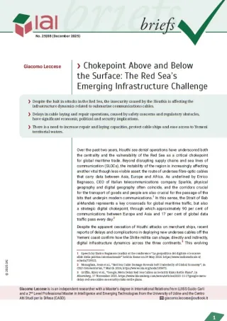 [6] Leccese, Giacomo and Ivan Zaccagnini, “Houthi e cavi sottomarini: analisi della nuova minaccia nei fondali del Mar Rosso”, in Rivista Marittima, Vol. 157, September-October 2024, p. 88-97, https://www.marina.difesa.it/media-cultura/editoria/marivista/Documents/2025/settembre_ottobre_2024.pdf.