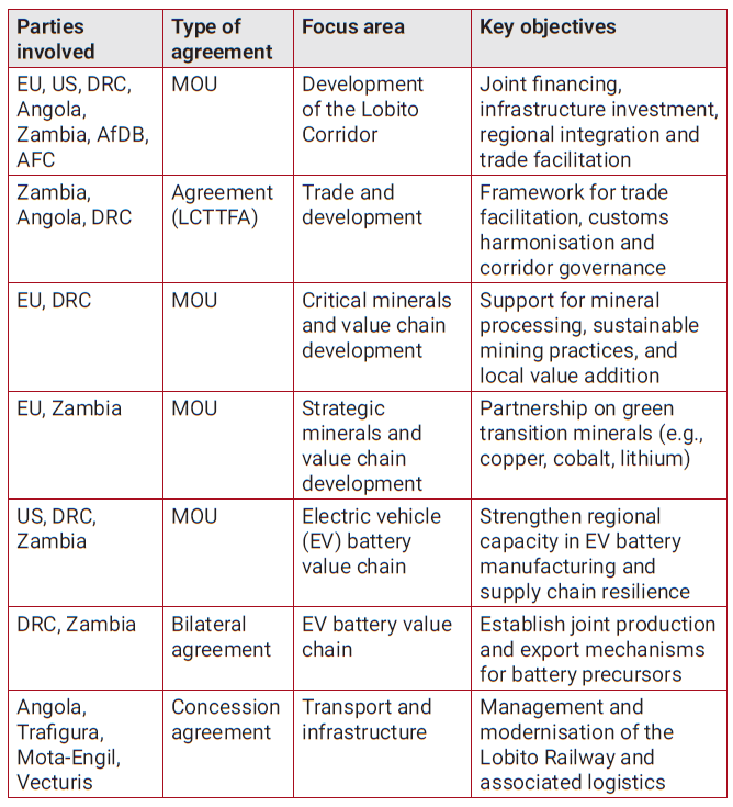 A global decarbonisation agenda and the rapid growth of the electric vehicle (EV) industry have intensified interest in the corridor, driving a surge in investments and attracting an increasing number of actors seeking opportunities in the region. The governments of the DRC and Zambia have signed several MOUs and agreements for infrastructure development to revitalise the corridor (see Table 1).