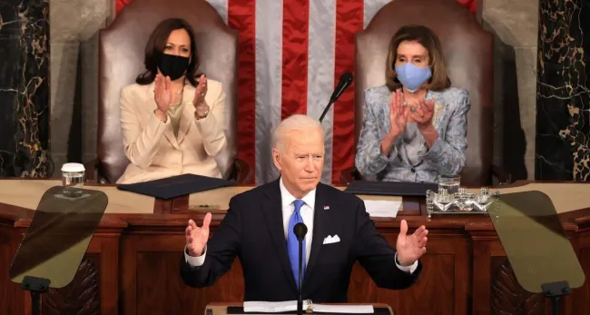 Parlando per la prima volta al Congresso riunito in sessione plenaria, il presidente statunitense Joe Biden traccia un bilancio dei suoi primi cento giorni alla Casa Bianca e prospetta un’espansione dei programmi federali. Dietro il podio di Biden, lo scranno della presidenza è occupato da Kamala Harris, vice-presidente e leader del Senato, e Nancy Pelosi, speaker della Camera.
