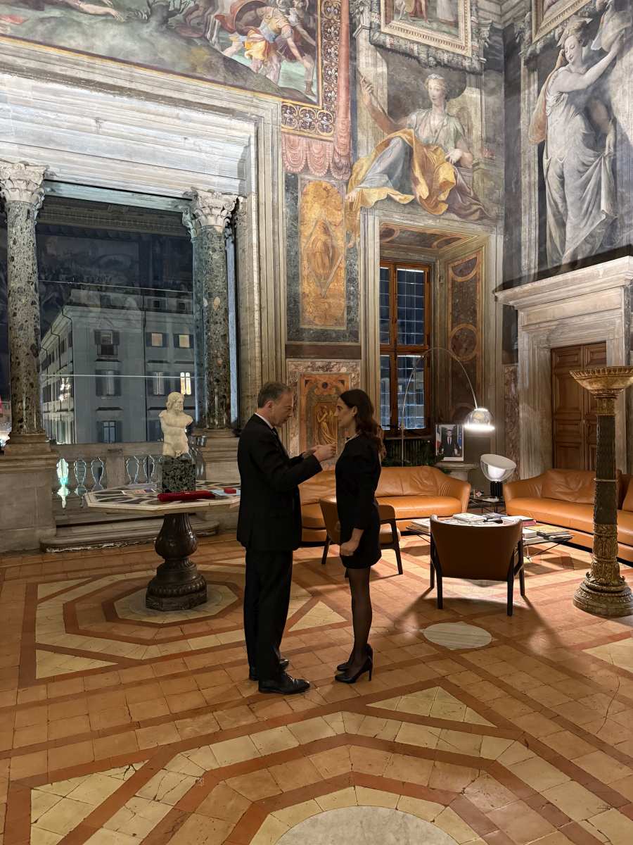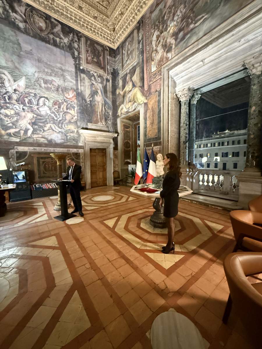 La cerimonia ufficiale si svolge presso il magnifico Palazzo Farnese, sede storica dell'Ambasciata di Francia a Roma.