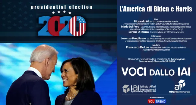 Webinar sulle elezioni americane organizzato dallo IAI e dalla rivista AffarInternazionali. Con: Riccardo Alcaro (coordinatore delle ricerche e responsabile del programma "Attori globali" dello IAI), Mario Del Pero (professore di Storia internazionale e storia della politica estera statunitense all'Institut d'études politiques/SciencesPo a Parigi), Serena Di Ronza (corrispondente per l'Ansa da New York).Interviene: Lorenzo Pregliasco (co-fondatore e partner dell'agenzia di ricerche sociali e comunicazione politica Quorum e direttore del magazine YouTrend). Modera: Francesco De Leo (responsabile della Comunicazione dello IAI e direttore di AffarInternazionali). Domande e curiosità delle redazioni de Lo Spiegone, Scomodo ed Elezioni USA2020.L'evento si è svolto in collaborazione con YouTrend.