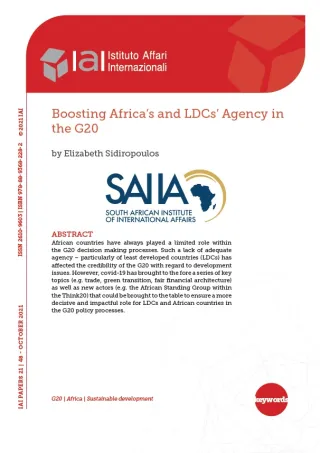 Il ruolo dei paesi africani nei processi decisionali del G20 è sempre stato limitato. È mancata un’adeguata rappresentanza, in particolare dei paesi meno sviluppati, e questo ha influito sulla credibilità del G20 per tutto ciò che riguarda lo sviluppo. La pandemia di Covid-19 ha portato però alla ribalta una serie di questioni chiave (quali l’interscambio commerciale, la transizione verde, un’architettura finanziaria equa) nonché nuovi attori (ad esempio l’African Standing Group all’interno del Think20) che potrebbero essere chiamati in causa per garantire ai paesi meno sviluppati e ai paesi africani un ruolo più decisivo e influente nei processi politici del G20.