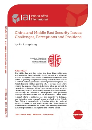 Il Medio Oriente e la regione del Golfo devono affrontare tre fattori di tensione e instabilità: quelli causati dalle politiche irratiche e unilaterali degli Stati Uniti, quelli legati al sottosviluppo economico e quelli legati alla crescente concorrenza tra gli attori regionali. La Cina sta e dovrà far fronte ai problemi economici derivanti dal Medio Oriente e ai crescenti appelli di assumere un ruolo più attivo nella regione, ruolo che però spesso va oltre le sue capacità o i suoi interessi. L’approccio cinese alla sicurezza regionale può essere classificato come il promuovere soluzioni politiche delle controversie, contribuire allo sviluppo economico e fornire risorse per la sicurezza nel quadro delle Nazioni Unite. La Cina sostiene gli sforzi regionali per ottenere pace e sicurezza attraverso il dialogo, includendo anche gli attori extraregionali coinvolti in Medio Oriente. La Cina è favorevole alla visione della Russia di una cooperazione regionale in materia di sicurezza e sosterrebbe la convocazione di una conferenza internazionale sulle questioni di sicurezza in Medio Oriente che comprenda ruoli specifici per gli attori regionali ed esterni.