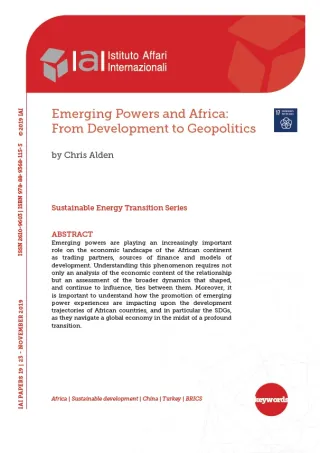 Nel panorama economico del continente africano cresce l’importanza del ruolo svolto dalle potenze emergenti come partner commerciali, finanziatori e modelli di sviluppo. Per comprendere questo fenomeno bisogna non solo analizzare l’aspetto economico di questi rapporti ma anche valutare le dinamiche più ampie che li hanno definiti e che continuano a influenzarli. È importante inoltre capire come le potenze emergenti, promuovendo le proprie esperienze, stiano influendo sui percorsi di sviluppo dei paesi africani - e in particolare sugli obiettivi di sviluppo sostenibile - mentre questi paesi si trovano nel bel mezzo di una profonda transizione dell’economia mondiale.