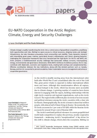 Il cambiamento climatico sta rapidamente trasformando l’Artico in un’arena al centro della competizione geopolitica, amplificando sia le opportunità che i rischi. Lo scioglimento dei ghiacci apre l’accesso a risorse critiche, rotte di navigazione e infrastrutture strategiche, ma mette anche in pericolo gli ecosistemi, le comunità locali e la stabilità. Queste dinamiche si intersecano con l’intensificarsi delle rivalità tra grandi potenze, in particolare la militarizzazione della Russia e la crescente presenza della Cina, mettendo a dura prova il quadro di cooperazione che un tempo caratterizza l’Artico. Quest’ultimo rappresenta per l’UE e la Nato una sfida multidimensionale per la sicurezza, che trascende le questioni militari abbracciando dimensioni energetiche, ambientali e di governance. Mentre la Nato rafforza la sua posizione difensiva, l’UE può contribuire con strumenti diplomatici, economici e normativi, creando sia sovrapposizioni che complementarietà. Un coordinamento efficace tra le due istituzioni, insieme a partner affini come Canada, Norvegia e Regno Unito, è essenziale per prevenire l’escalation, promuovere una gestione sostenibile delle risorse e migliorare la governance cooperativa.