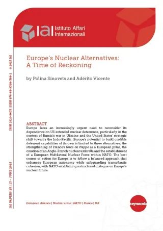 L’Europa si trova a dover riconsiderare con sempre maggiore urgenza la propria dipendenza dalla deterrenza nucleare degli Stati Uniti, soprattutto considerando la guerra russa in Ucraina e lo spostarsi della strategia Usa verso l’Indo-Pacifico. Per l’Europa la possibilità di creare capacità di deterrenza credibili si limita a tre alternative: il rafforzamento della force de frappe francese come pilastro europeo, la creazione di un ‘ombrello’ nucleare anglo-francese e l’istituzione di una forza nucleare multilaterale europea all’interno della Nato. Per l’Europa il miglior modo di procedere sarebbe seguire un approccio equilibrato che rafforzi l’autonomia europea salvaguardando al contempo la coesione transatlantica, con la Nato che instaura un dialogo strutturato sul futuro nucleare dell’Europa.