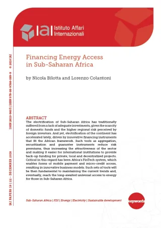 Il processo di elettrificazione dell’Africa subsahariana ha tradizionalmente sofferto per l’assenza di investimenti adeguati, visti gli scarsi fondi dei paesi dell’area e la percezione degli investitori stranieri di un forte rischio nella regione. Di recente l’elettrificazione del continente ha però subito un’accelerazione grazie a strumenti di finanziamento innovativi, adatti al contesto africano. Strumenti quali l’aggregazione, la cartolarizzazione e gli strumenti di garanzia riducono i premi di rischio, aumentando così l’attrattiva del settore e rendendo più facile per le istituzioni internazionali offrire finanziamenti a sostegno di progetti privati, locali e decentralizzati. A tale riguardo è stato fondamentale il sistema africano di servizi finanziari ad alta intensità tecnologica, che consente forme di pagamento tramite dispositivo mobile e di accesso al microcredito, con conseguenti innovativi modelli di business. Questi strumenti saranno quindi essenziali per sostenere le tendenze attuali e giungere infine a quell’accesso universale all’energia a lungo atteso per tutta l’Africa sub-sahariana.
