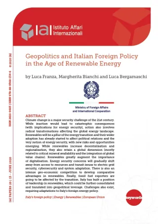 Studio realizzato nell'ambito del progetto IAI “La geopolitica nell’era delle energie rinnovabili: sfide e opportunità per la politica estera italiana”, giugno 2020. Traduzione di “Geopolitics and Italian Foreign Policy in the Age of Renewable Energy”.