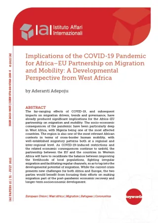 Gli effetti di vasta portata del covid-19 e quelli secondari sulle cause, le tendenze e la governance della migrazione hanno già comportato significative implicazioni per il partenariato tra l’Africa e l’Unione europea in materia di migrazione e mobilità. Le conseguenze socioeconomiche della pandemia sono state particolarmente gravi in Africa occidentale, dove la Nigeria è uno dei paesi più colpiti. La regione è anche uno dei contesti africani più rilevanti in termini di mobilità umana transfrontaliera, con modelli migratori consolidati sia a livello regionale che interregionale. A seguito dei continui sviluppi delle restrizioni indotte dal covid-19 e delle relative conseguenze economiche, il partenariato tra l’Ue e i paesi dell’Africa occidentale dovrà ricalibrare l’equilibrio tra il migliorare i mezzi di sussistenza delle popolazioni locali, la lotta alla migrazione irregolare e l’agevolare i canali regolari della migrazione, in modo da poterne sfruttare il potenziale di sviluppo. L’attuale crisi presenta nuove sfide sia per l’Africa che per l’Europa, ma entrambe trarrebbero vantaggio dal concentrare gli sforzi nel far sì che la migrazione sia parte della ripresa economica post-pandemia e dello sviluppo socioeconomico a lungo termine.