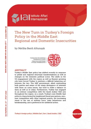 La politica in Medio Oriente della Turchia è di recente cambiata in risposta a trasformazioni globali e regionali strutturali e ai cambiamenti nello scenario politico interno. Il mutato impegno degli Stati Uniti nella regione e il crescente ruolo della Russia hanno costretto la Turchia a tenersi in un difficile equilibrio tra i due. Il governo dell’Akp, pur diffidando di entrambi e consapevole della sua forte divergenza di interessi con loro su alcune questioni, ha cercato di trovare un equilibrio in Siria e in Libia. La Turchia si è inoltre impegnata in una forte competizione con l’asse Arabia Saudita-Emirati in tutta la regione. La nuova politica turca in Medio Oriente è di conseguenza caratterizzata da una maggiore percezione della minaccia, da una concorrenza a somma zero con altre potenze regionali, dal crescente ricorso all’uso della forza militare, da comportamenti pericolosi e da una politica del rischio calcolato, nonché da una preferenza per l’azione unilaterale.