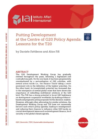 Il Gruppo di lavoro sullo Sviluppo del G20 si è evoluto progressivamente nel corso degli anni seguendo un percorso casuale e contraddittorio. Da un lato è stato progressivamente oscurato da una settorializzazione delle attività del G20, con diverse linee d’azione (ad esempio il Finance Track) che hanno assunto un ruolo più importante nel definire le priorità dei leader. D’altra parte il suo potenziale (non sfruttato) è aumentato a causa dell’emergere di diverse crisi globali che hanno dimostrato l’importanza di riproporre soluzioni multilaterali a livello del G20. Il T20 potrebbe davvero rafforzare la legittimità del G20 sulla cooperazione allo sviluppo nel mondo, redigendo per i decisori proposte politiche pragmatiche e basate su dati concreti. Ma, nonostante propongano spesso soluzioni simili, il gruppo di lavoro sullo sviluppo e il T20 non sono necessariamente entrati nelle rispettive agende politiche, e ciò ha portato a un disallineamento e ha ridotto la loro possibilità di influenzare altri percorsi del G20 su questioni cruciali per lo sviluppo come il finanziamento dello sviluppo, la sicurezza alimentare o l’agenda climatica globale.