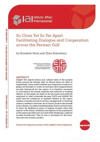 Gli stati che si affacciano sul Golfo Persico si ritrovano spesso ai ferri corti, nonostante i popoli che vi vivono intorno condividano storia e tratti culturali. Tutti i tentativi di creare un quadro di sicurezza regionale inclusivo e completo continuano a soffrire per radicate rivalità e sospetti. È necessario quindi guardare oltre i formali canali e metodi volti a creare la distensione. In questo studio gli autori si rifanno ai processi e ai metodi impiegati in quelle che alla fine sono diventate l’Osce e l’Asean. Sostengono che lo sforzo per facilitare una distensione nella regione richiede un approccio più ampio e più dal basso verso l’alto per promuovere la fiducia reciproca. Tali progetti “track 2” beneficiano anche di una più approfondita comprensione concettuale della pace e della sicurezza. In breve, pensando in termini di sicurezza umana, si considerano altri aspetti essenziali delle condizioni di vita e della dignità delle popolazioni della regione quando si progetta un'architettura di sicurezza regionale. Ciò è a sua volta necessario per il successo a lungo termine di un tale progetto.