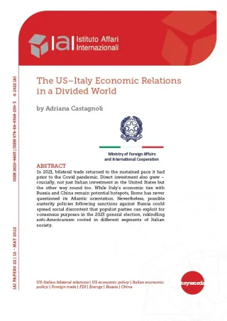 Nel 2021 il commercio bilaterale è tornato a crescere al ritmo sostenuto che aveva prima della pandemia di Covid. Anche gli investimenti diretti sono cresciuti e, cosa cruciale, non solo gli investimenti italiani negli Stati Uniti ma anche il contrario. I legami economici dell’Italia con la Russia e la Cina continuano a rappresentare potenziali questioni calde, ma Roma non ha mai messo in dubbio il suo orientamento atlantico. Le eventuali politiche di austerità causate dalle sanzioni contro la Russia potrebbero però diffondere un malcontento sociale che i partiti populisti possono sfruttare a fini di consenso nelle elezioni politiche del 2023, riaccendendo l’antiamericanismo radicato in diversi segmenti della società italiana.