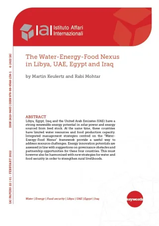 Libia, Egitto, Iraq ed Emirati Arabi Uniti hanno un notevole potenziale di energia rinnovabile grazie all’energia solare e all’energia proveniente da materie prime. Al tempo stesso questi paesi hanno limitate risorse idriche e una limitata capacità di produzione alimentare. Le strategie di gestione integrata incentrate sul quadro di riferimento del “nesso acqua-energia-cibo” offrono un percorso utile per affrontare i problemi relativi alle risorse. I potenziali di innovazione energetica sono valutati nel presente studio tenendo conto dei consigli relativi agli ostacoli di governance e alle opportunità di partenariato per questi quattro paesi. Tutto ciò deve però anche accordarsi con nuove strategie per la sicurezza idrica e alimentare al fine di rafforzare i mezzi di sussistenza nelle zone rurali.