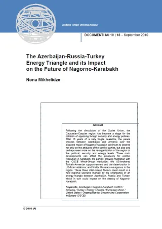 Following the dissolution of the Soviet Union, the Caucasian-Caspian region has become a stage for the collision of opposing foreign security and energy policies. After 16 years of a very fragile ceasefire, the peace process between Azerbaijan and Armenia over the disputed region of Nagorno-Karabakh continues to depend not only on the attitudes of the conflict parties, but also and perhaps even more on the re-organization of the region at the political, security and energy levels. Three main developments can affect the prospects for conflict resolution in Karabakh: the parties’ growing frustration with the OSCE Minsk-Group mediation; the US-brokered Turkish-Armenian rapprochement and the deterioration in US-Azeri relations; and finally, Russia’s resurgence in the region. These three inter-related factors could result in a new regional scenario marked by the emergence of an energy triangle between Azerbaijan, Russia and Turkey, which in turn could impact on the destiny of Nagorno-Karabakh.