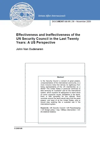 Documento presentato al primo incontro del Gruppo di lavoro I "The EU and the reform of the UN Security Council", organizzato a Roma il 12-13 novembre 2009 dall'Istituto Affari Internazionali (IAI) nell'ambito del progetto di ricerca "The European Union and the Reform of the United Nations" (The EU as a global actor in the UN reform process). Versione successiva: "Effectiveness and Ineffectiveness of the UN Security Council in the last 20 Years: a US Perspective", in Joachim Krause and Natalino Ronzitti (eds.), The EU, the UN and Collective Security. Making Multilateralism Effective, London/New York, Routledge, 2012, p. 53-69.