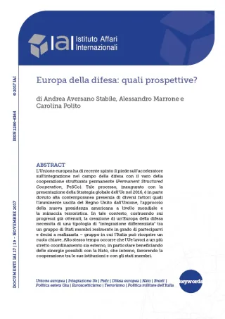 L’Unione europea ha di recente spinto il piede sull’acceleratore sull’integrazione nel campo della difesa con il varo della cooperazione strutturata permanente (Permanent Structured Cooperation, PeSCo). Tale processo, inaugurato con la presentazione della Strategia globale dell’Ue nel 2016, è in parte dovuto alla contemporanea presenza di diversi fattori quali l’imminente uscita del Regno Unito dall’Unione, l’approccio della nuova presidenza americana a livello mondiale e la minaccia terroristica. In tale contesto, costruendo sui progressi già ottenuti, la creazione di un’Europa della difesa necessita di una tipologia di “integrazione differenziata” tra un gruppo di Stati membri realmente in grado di parteciparvi e decisi a realizzarla – gruppo in cui l’Italia può ricoprire un ruolo chiave. Allo stesso tempo occorre che l’Ue lavori a un più stretto coordinamento sia esterno, in particolare beneficiando delle sinergie possibili con la Nato, che interno, favorendo la cooperazione tra le sue istituzioni e con gli stati membri.
