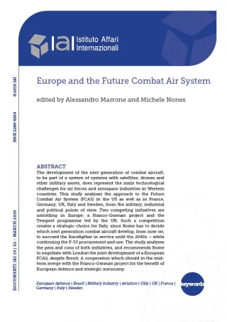 Lo sviluppo della prossima generazione di velivoli da combattimento, fortemente integrati con droni, satelliti ed altri assetti militari, costituisce la principale sfida tecnologica per le aeronautiche e l’industria dell’aerospazio dei Paesi occidentali. Lo studio analizza l’approccio al Future Combat Air System (FCAS) negli Usa e in Francia, Germania, Regno Unito, Italia e Svezia, dal punto di vista militare, industriale e politico. In Europa si stanno delineando due iniziative concorrenti: una a guida franco-tedesca e l’altra – il Tempest – a trazione inglese. Ciò pone l’Italia di fronte ad una scelta strategica su quale velivolo di prossima generazione deve essere sviluppato sin da ora per sostituire poi gli Eurofighter tra 15-20 anni – proseguendo nel frattempo l’acquisizione ed impiego degli F-35. Lo studio valuta i pro e contro di entrambe le iniziative, raccomandando infine che Roma negozi con Londra lo sviluppo congiunto di un FCAS europeo, nonostante la Brexit, in un progetto che auspicabilmente convergerà con quello di Francia e Germania a beneficio dell’Europa della difesa e dell’autonomia strategica europea.