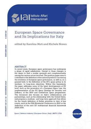 Negli ultimi anni la governance europea dello spazio ha vissuto una fase di rapida ridefinizione. Al centro di questi cambiamenti vi è la volontà di trovare un modus operandi e complementarità tra i vari attori coinvolti. Questo studio vuole contribuire alla definizione della posizione nazionale rispetto all’evoluzione della governance europea del settore spaziale, nonché, più in generale, alla definizione della politica spaziale dell’UE nei suoi obiettivi a medio-lungo termine. In questo quadro, lo studio affronta alcuni degli ultimi sviluppi a livello comunitario, come la promozione di una legge spaziale dell’UE, l’implementazione della strategia spaziale per la sicurezza e la difesa, o i programmi spaziali Iris2 e GovSatCom. Il documento si sofferma inoltre sulle collaborazioni e partnership dell’Italia, come il rapporto con gli Stati Uniti, e propone un approccio di medio-lungo periodo che permetta di definire tempestivamente le priorità italiane in vista di appuntamenti chiave, come la Conferenza ministeriale Esa del 2025 o la definizione del prossimo quadro finanziario pluriennale 2028-2034 dell’UE.