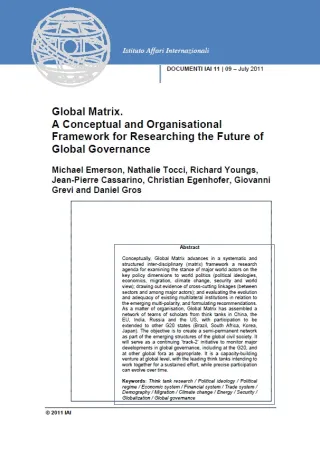 Documento preparato da un network inizialmente composto da Centre for European Policy Studies (CEPS), Istituto affari internazionali (IAI), Fundación para las relaciones internacionales y el diálogo exterior (FRIDE), Fudan University, Johns Hopkins University Washington, Delhi Policy Group e Carnegie Moscow Center. Pubblicato anche in CEPS Working Documents, No. 355 (July 2011).