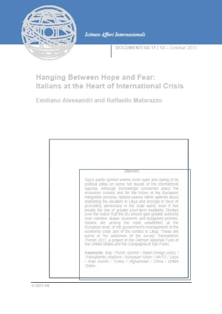 Italy’s public opinion seems more open and daring of its political elites on some hot issues of the international agenda. Although increasingly concerned about the economic context and for the future of the European integration process, Italians seems rather optimist about stabilizing the situation in Libya and strongly in favor of promoting democracy in the Arab world, even if this entails the risk of greater short-term instability. Divided over the notion that the EU should gain greater authority over member states’ economic and budgetary policies, Italians are among the most unsatisfied, at the European level, of the government’s management of the economic crisis and of the conflict in Libya. These are some of the outcomes of the survey Transatlantic Trends 2011, a project of the German Marshall Fund of the United States and the Compagnia di San Paolo.