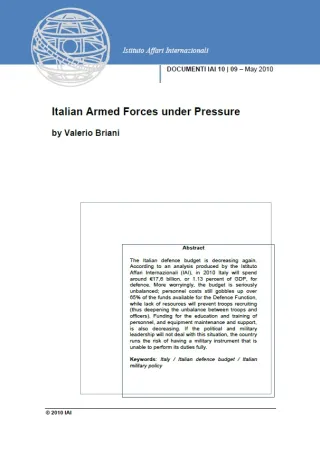 The Italian defence budget is decreasing again. According to an analysis produced by the Istituto Affari Internazionali (IAI), in 2010 Italy will spend around €17,6 billion, or 1.13 percent of GDP, for defence. More worryingly, the budget is seriously unbalanced; personnel costs still gobbles up over 65% of the funds available for the Defence Function, while lack of resources will prevent troops recruiting (thus deepening the unbalance between troops and officers). Funding for the education and training of personnel, and equipment maintenance and support, is also decreasing. If the political and military leadership will not deal with this situation, the country runs the risk of having a military instrument that is unable to perform its duties fully.